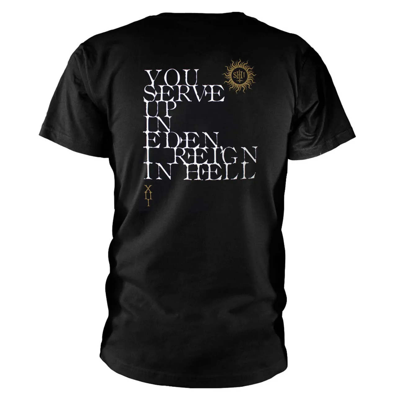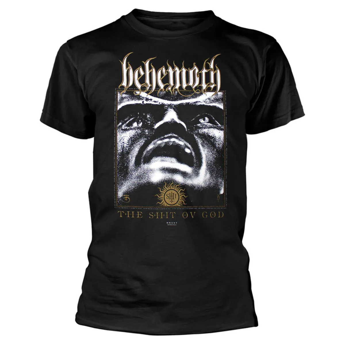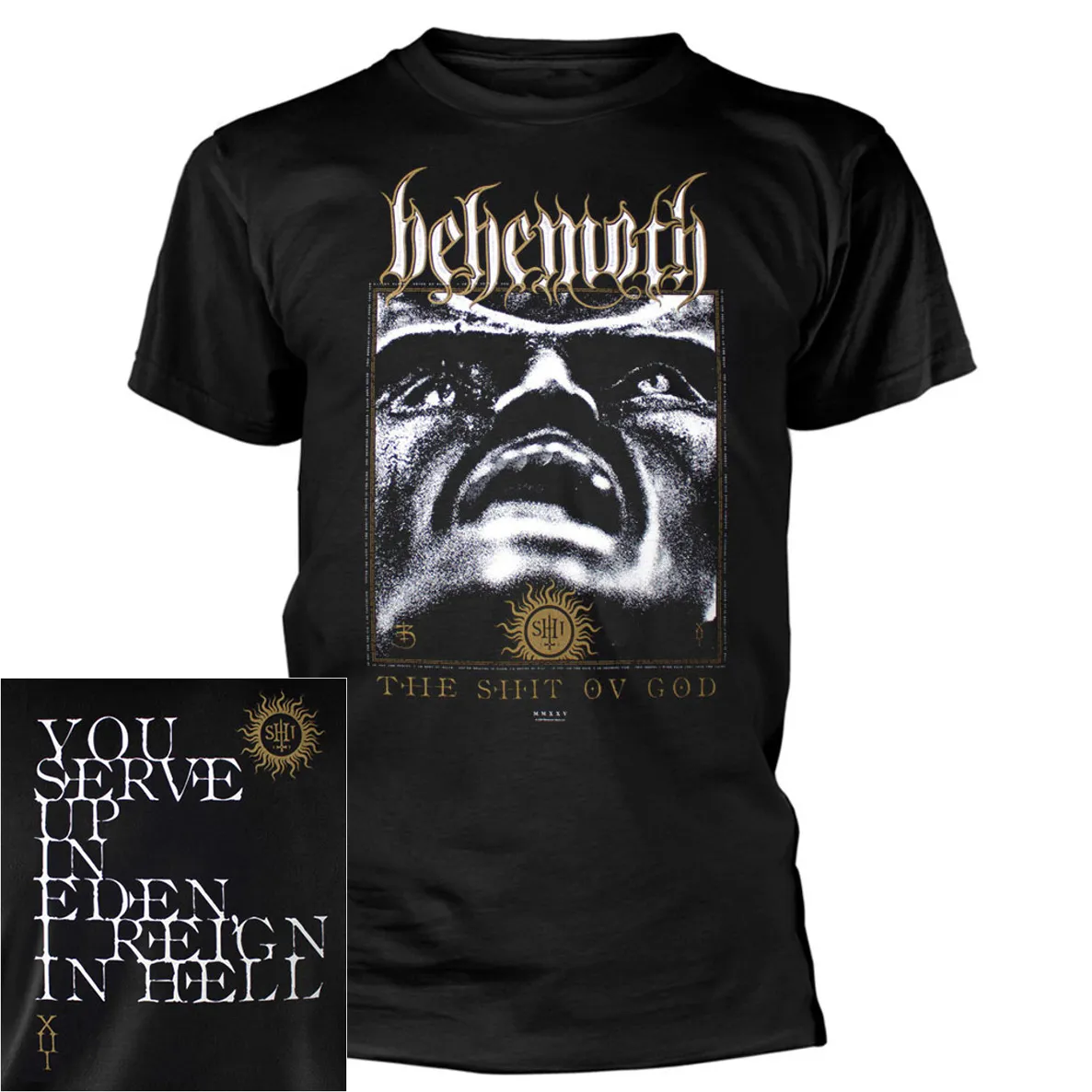 Official licensed Behemoth t-shirt featuring The Shit Ov God Reign In Hell design on a black shirt. This 100% cotton band tee showcases bold, provocative artwork from Poland’s extreme metal legends in spired by thier thirteenth album The Shit Ov God, perfect for fans of Nergal and blackened death metal. Ideal for gigs, festivals, or everyday wear, this officially licensed Behemoth shirt is a must-have collectible for extreme metal enthusiasts and die-hard band supporters.