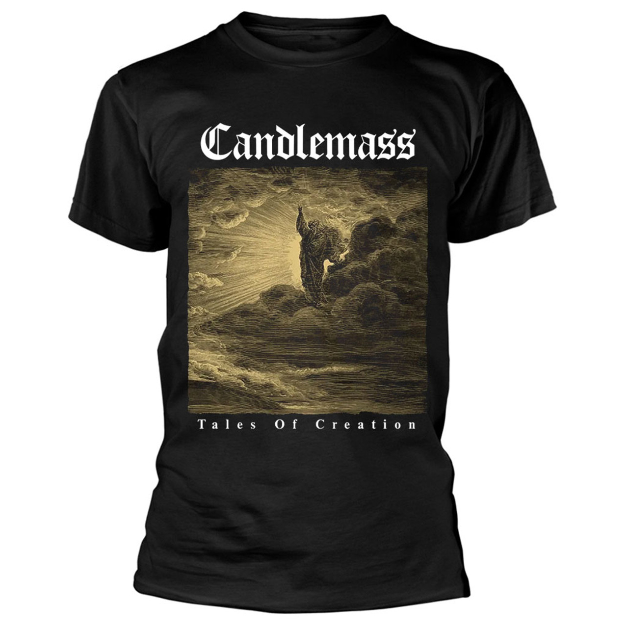 Official new t-shirt from Swedish epic doom metal band Candlemass featuring design from their fourth album Tales of Creation on black shirt.