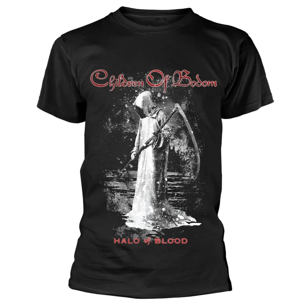 Official Children of Bodom Halo of Blood t-shirt, inspired by the band’s eighth album, released in 2013, which marked a fierce return to their aggressive roots while maintaining their signature blend of melody and technical precision.