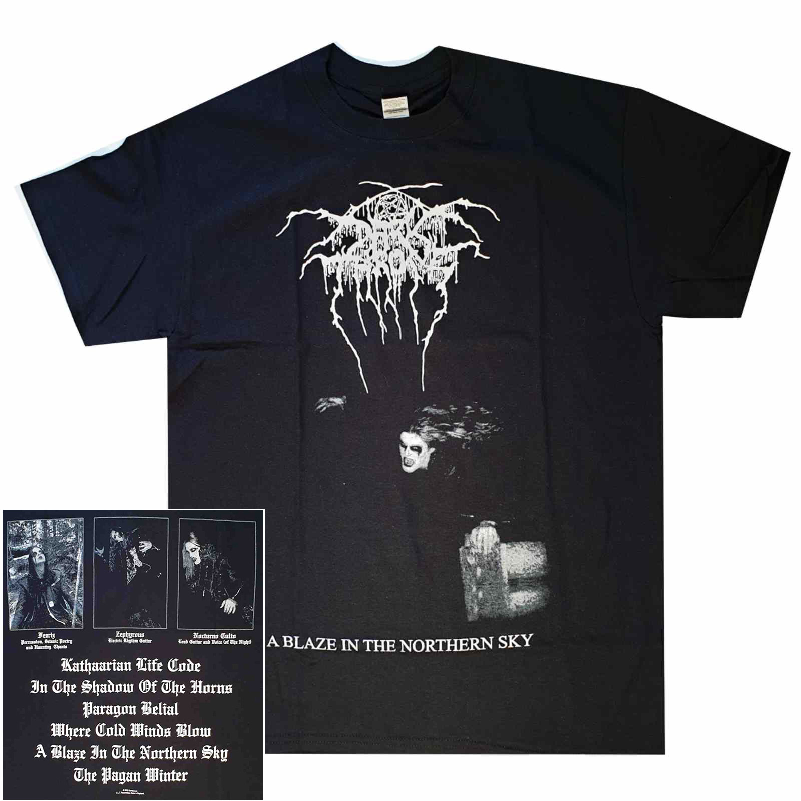 Official Darkthrone A Blaze in the Northern Sky T-Shirt is a premium piece of officially licensed merchandise celebrating one of the most important releases in black metal history. Featuring artwork inspired by A Blaze in the Northern Sky and a full tracklist design on the back, this shirt represents the early transformation of Darkthrone into one of the most influential forces in extreme metal.