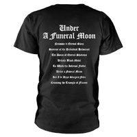 Official Darkthrone Under A Funeral Moon Album design T-Shirt is authentic merchandise from the legendary Norwegian black metal pioneers Darkthrone, celebrating one of the most influential and defining releases in extreme metal history. Featuring front artwork inspired by the cult 1993 album Under a Funeral Moon and a full tracklist printed on the back, this shirt captures the raw and uncompromising spirit of early 90s black metal.