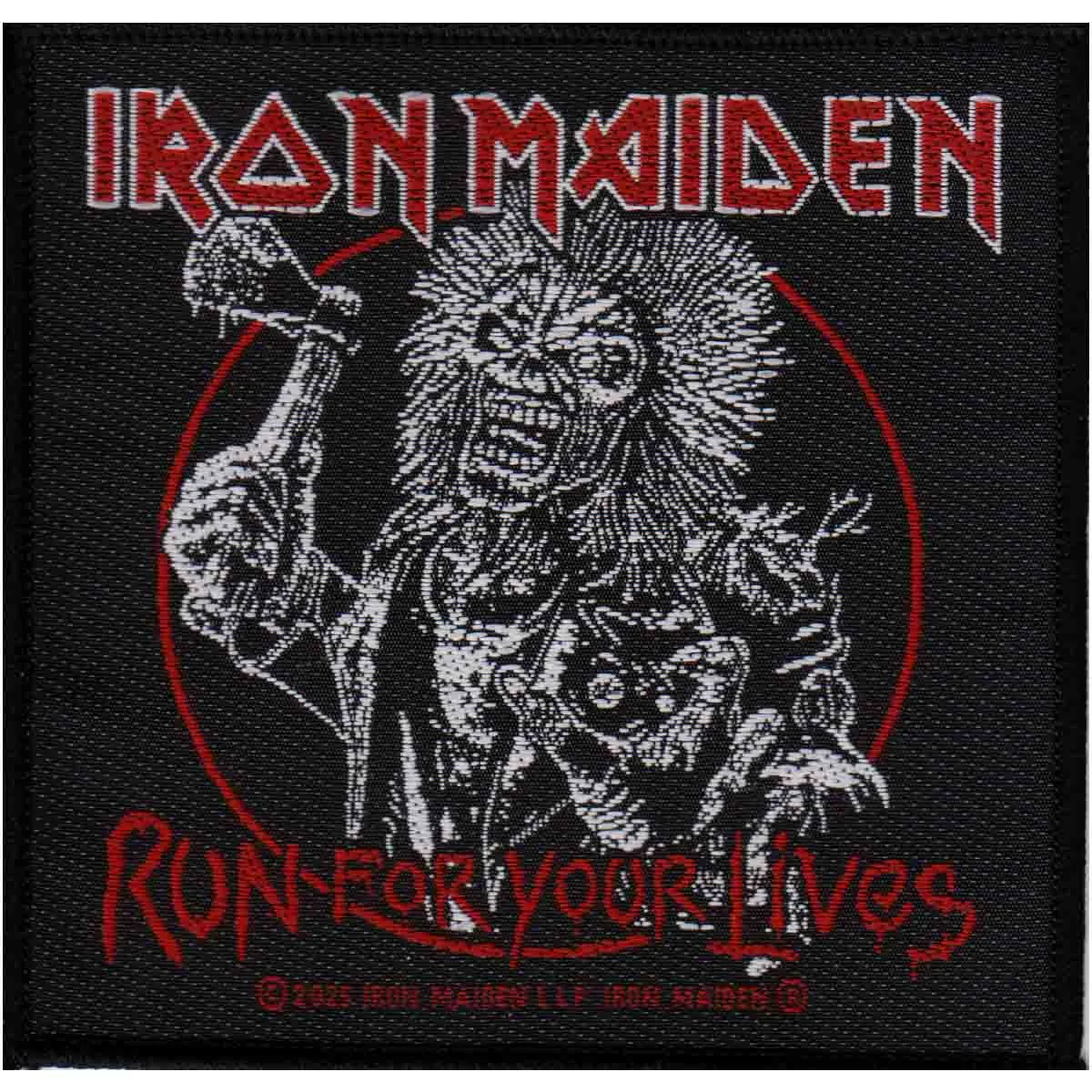 Official sew-on embroidered patch from the English heavy metal band Iron Maiden featuring Run For Your Lives design.