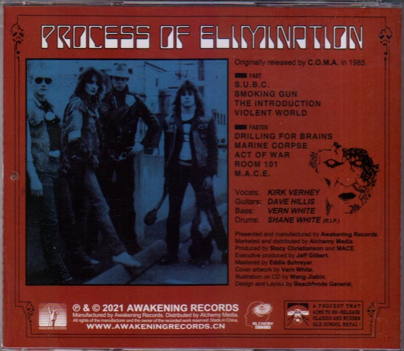 Mace’s ‘Process Of Elimination’ (P.O.E.) falls between conventional metal and anarchist punk valleys, based in nasty chords rather than melodies. Call it ‘Metallic Punk’, ‘Punky Metal’, or whatever, but Mace’s proposal was very different from that of their contemporaries.