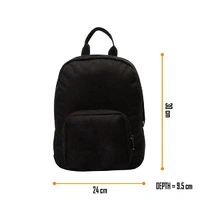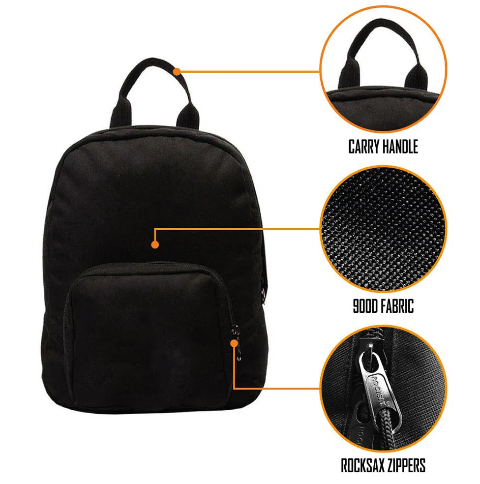 Features include a smaller version of the classic Rocksax backpack, spacious main compartment, zip-fastening front pocket, adjustable padded shoulder straps, back panel for added comfort, height 30cm, width 24cm, depth 9.5cm, and durable 900D polyester with 210D polyester lining.